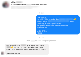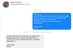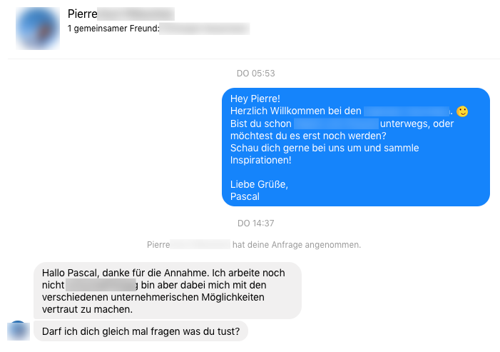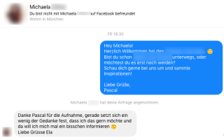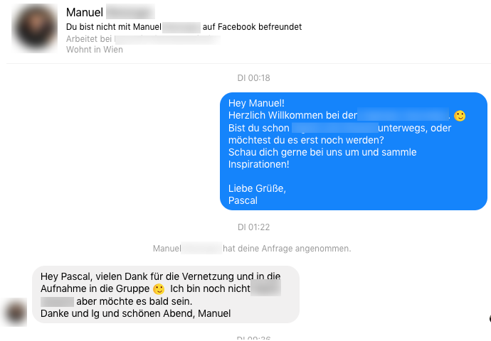 Mit geschickter Formulierung erhält die Person, die neu in die Gruppe eingetreten ist, den Eindruck, dass ihr sie in die Gruppe aufgenommen habt. Sie hält euch somit für einen Profi und wird mit hoher Wahrscheinlichkeit reagieren.