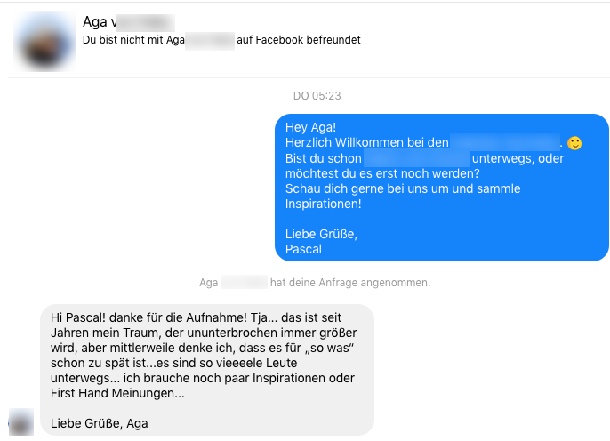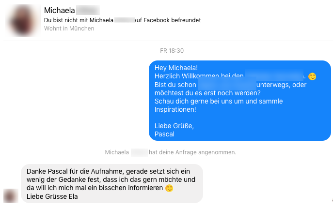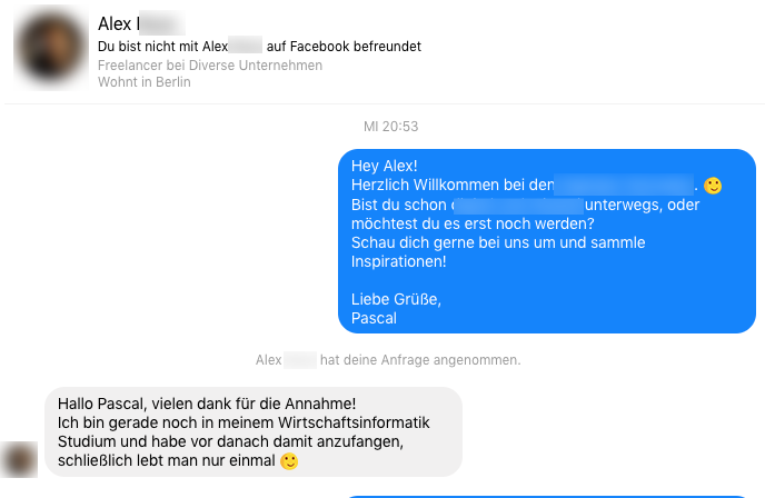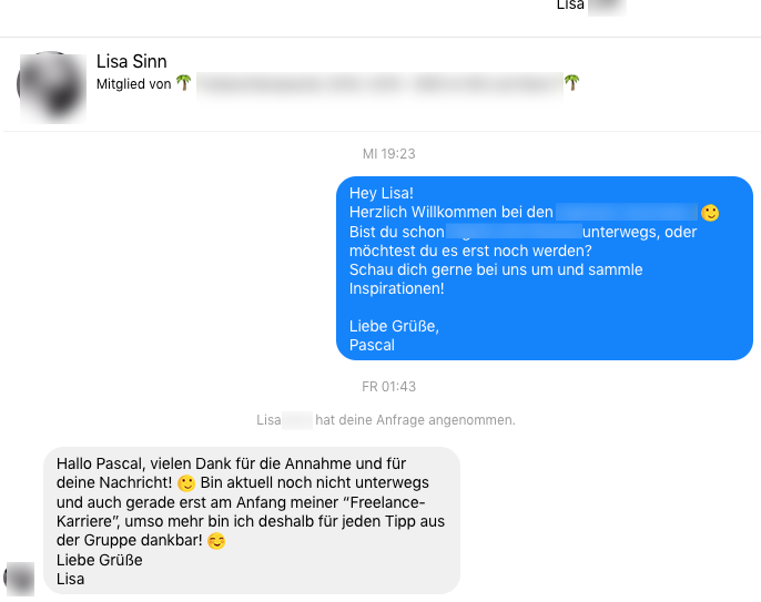 Da die Nachricht thematisch passend ist, unmittelbar kurz nach der Bestätigung zur Gruppenmitgliedschaft erfolgte, ist die Response-Quote extrem hoch.