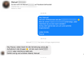 2.) Deine erste Nachricht, die der Bot automatisiert sendet, sollte sehr zum Thema der Gruppe passen und am Besten noch keine Werbung erhalten. Enthält direkt die 1. Nachricht einen Link so besteht eine sehr große Gefahr, dass der Nachrichtenempfänger skeptisch wird und womöglich sogar die Nachricht als Spam einstuft. Daher sollte die 1. Nachricht einen kleinen Mehrwert geben, keine Werbung beinhalten und eine Frage beinhalten, welche gerne beantwortet wird.